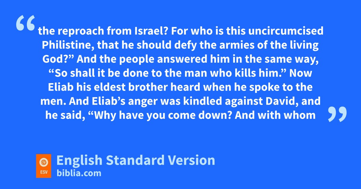 41 And the Philistine moved forward and came near to David, hwith his shield-bearer in front of him. 42 And when the Philistine looked and saw David, he disdained him, for he was but a youth, iruddy and handsome in appearance. 43 And the Philistine said to David, “Am I ja dog, that you come to me with sticks?” And the Philistine cursed David by his gods. 44 The Philistine said to David, “Come to me, and I will give your flesh kto the birds of the air and to the beasts of the field.” 45 Then David said to the Philistine, “You come to me with a sword and with a spear and with la javelin, but I come to you in the name of the Lord of hosts, the God of the armies of Israel, ewhom you have defied. 46 This day the Lord will deliver you into my hand, and I will strike you down and cut off your head. mAnd I will give the dead bodies of the host of the Philistines this day nto the birds of the air and to the wild beasts of the earth, othat all the earth may know that there is a God in Israel, 47 and that all this assembly may know that pthe Lord saves not with sword and spear. qFor the battle is the Lord’s, and he will give you into our hand.”