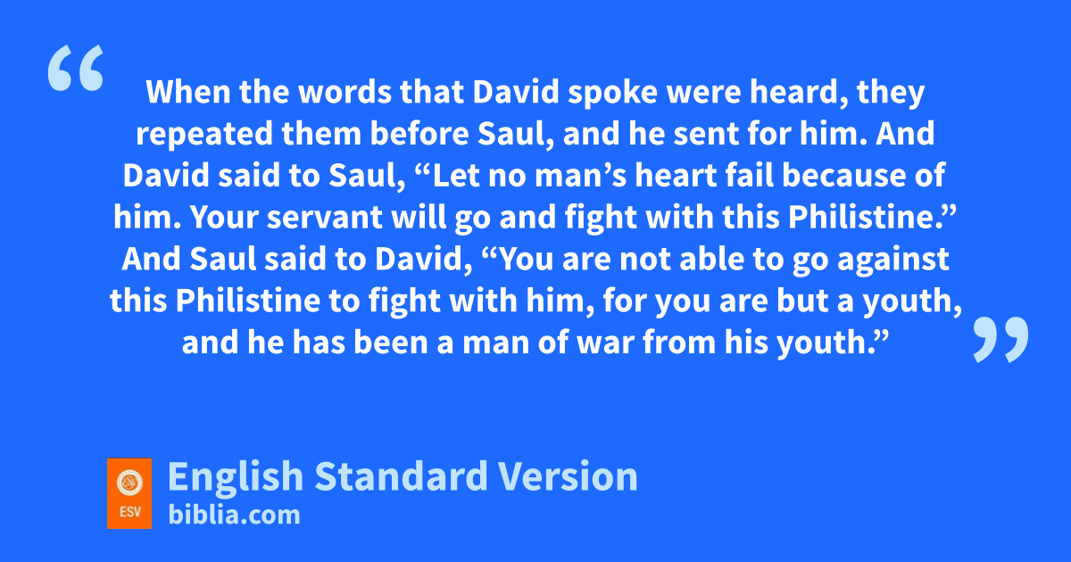 31 When the words that David spoke were heard, they repeated them before Saul, and he sent for him. 32 And David said to Saul, c“Let no man’s heart fail because of him. dYour servant will go and fight with this Philistine.” 33 And Saul said to David, “You are not able to go against this Philistine to fight with him, for you are but a youth, and he has been a man of war from his youth.” 34 But David said to Saul, “Your servant used to keep sheep for his father. And when there came a lion, or a bear, and took a lamb from the flock, 35 I went after him and struck him and delivered it out of his mouth. And if he arose against me, I caught him by his beard and struck him and killed him. 36 Your servant has struck down both lions and bears, and this uncircumcised Philistine shall be like one of them, efor he has defied the armies of the living God.” 37 And David said, f“The Lord who delivered me from the paw of the lion and from the paw of the bear will deliver me from the hand of this Philistine.” And Saul said to David, “Go, gand the Lord be with you!”