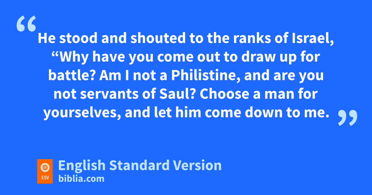17 Now the Philistines vgathered their armies for battle. And they were gathered at wSocoh, which belongs to Judah, and encamped between Socoh and xAzekah, in yEphes-dammim. 2 And Saul and the men of Israel were gathered, and encamped in zthe Valley of Elah, and drew up in line of battle against the Philistines. 3 And the Philistines stood on the mountain on the one side, and Israel stood on the mountain on the other side, with a valley between them. 4 And there came out from the camp of the Philistines a champion named aGoliath of bGath, whose height was six1 cubits2 and a span. 5 He had a helmet of bronze on his head, and he was armed with a coat of mail, and the weight of the coat was five thousand shekels3 of bronze. 6 And he had bronze armor on his legs, and a cjavelin of bronze slung between his shoulders. 7 The shaft of his spear was like a weaver’s beam, and his spear’s head weighed six hundred shekels of iron. dAnd his shield-bearer went before him. 8 He stood and shouted to the ranks of Israel, “Why have you come out to draw up for battle? Am I not a Philistine, and eare you not servants of Saul? Choose a man for yourselves, and let him come down to me. 9 If he is able to fight with me and kill me, then we will be your servants. But if I prevail against him and kill him, then you shall be our servants fand serve us.” 10 And the Philistine said, g“I defy the ranks of Israel this day. Give me a man, that we may fight together.” 11 When Saul and all Israel heard these words of the Philistine, they were dismayed and greatly afraid.