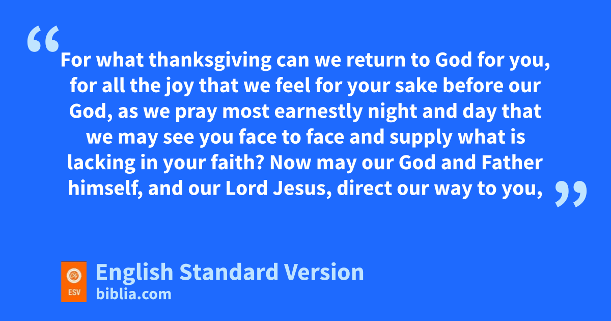 6 But mnow that Timothy has come to us from you, and has brought us the good news of nyour faith and love and reported othat you always remember us kindly and plong to see us, as we long to see you— 7 for this reason, brothers,2 in all our distress and affliction qwe have been comforted about you through your faith. 8 For now we live, if you rare standing fast in the Lord. 9 For swhat thanksgiving can we return to God for you, for all the joy that we feel for your sake before our God, 10 as we pray most earnestly tnight and day uthat we may see you face to face and vsupply what is lacking in your faith?
