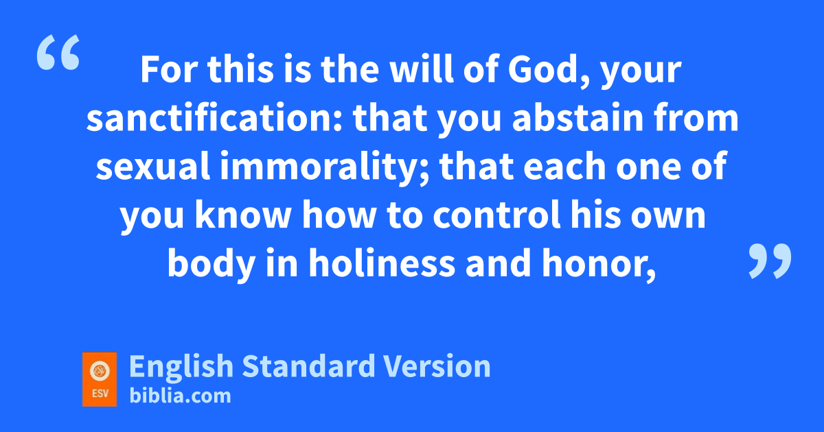 4 Finally, then, brothers,1 we ask and urge you in the Lord Jesus, that as you dreceived from us ehow you ought to walk and fto please God, just as you are doing, that you gdo so more and more. 2 For hyou know what instructions we gave you through the Lord Jesus. 3 For this is the will of God, iyour sanctification:2 jthat you abstain from sexual immorality; 4 that each one of you know how to control his own kbody3 in holiness and lhonor, 5 not in mthe passion of lust nlike the Gentiles owho do not know God; 6 that no one transgress and pwrong his brother in this matter, because the Lord is qan avenger in all these things, as we told you beforehand and solemnly warned you. 7 For rGod has not called us for simpurity, but in holiness. 8 Therefore twhoever disregards this, disregards not man but God, uwho gives his Holy Spirit to you.