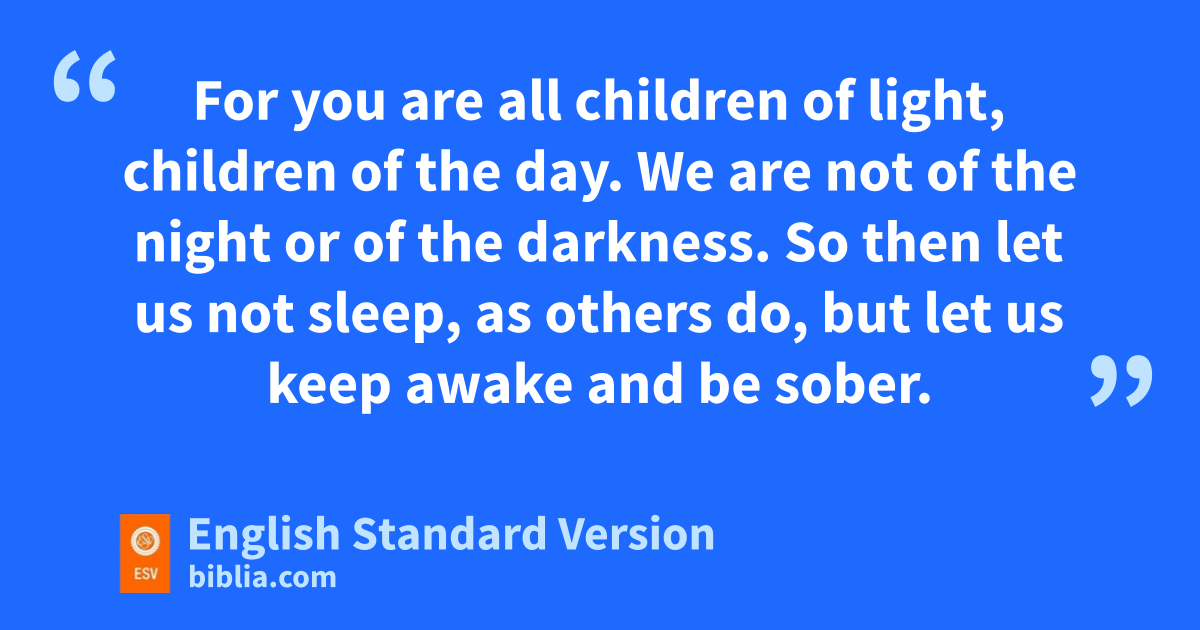 5 Now concerning wthe times and the seasons, brothers,1 xyou have no need to have anything written to you. 2 For you yourselves are fully aware that ythe day of the Lord will come like a thief in the night. 3 While people are saying, “There is peace and security,” then zsudden destruction will come upon them aas labor pains come upon a pregnant woman, and they will not escape. 4 But you bare not in darkness, brothers, for that day to surprise you like a thief. 5 For you are all cchildren2 of light, children of the day. We are not of the night or of the darkness. 6 So then dlet us not sleep, as others do, but let us ekeep awake and fbe sober. 7 For those who sleep, sleep at night, and those who get drunk, gare drunk at night. 8 But since we belong to the day, let us be sober, hhaving put on the breastplate of ifaith and love, and for a helmet the hope of salvation. 9 For God has not destined us for jwrath, but kto obtain salvation through our Lord Jesus Christ, 10 lwho died for us so that whether we are awake or asleep we might live with him. 11 Therefore encourage one another and build one another up, just as you are doing.