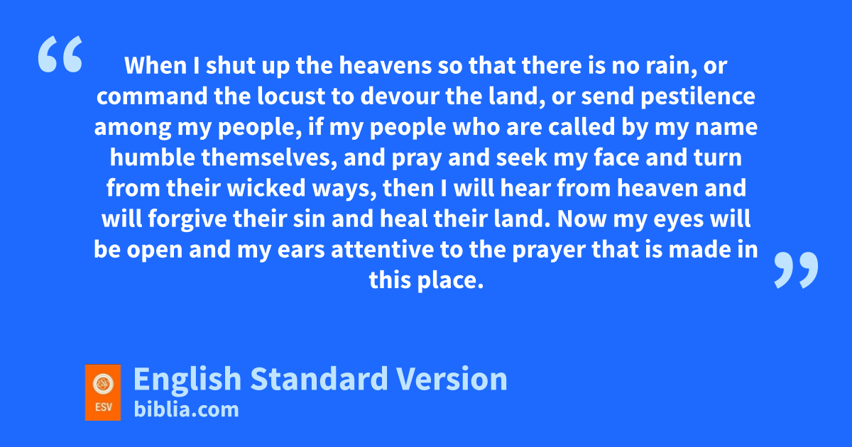 11 dThus Solomon finished the house of the Lord and the king’s house. All that Solomon had planned to do in the house of the Lord and in his own house he successfully accomplished. 12 Then the Lord appeared to Solomon in the night and said to him: “I have heard your prayer eand have chosen this place for myself as a house of sacrifice. 13 fWhen I shut up the heavens so that there is no rain, or command the locust to devour the land, or send pestilence among my people, 14 if my people who are called by my name ghumble themselves, and pray and seek my face and turn from their wicked ways, then I will hear from heaven and will forgive their sin and heal their land. 15 hNow my eyes will be open and my ears attentive to the prayer that is made in this place. 16 eFor now I have chosen and consecrated this house that my name may be there forever. My eyes and my heart will be there for all time. 17 And as for you, if you will walk before me as David your father walked, doing according to all that I have commanded you and keeping my statutes and my rules, 18 then I will establish your royal throne, as I covenanted with David your father, saying, i‘You shall not lack a man to rule Israel.’