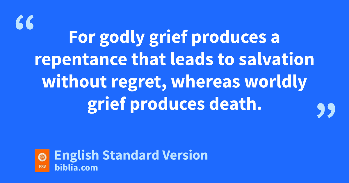 10 For xgodly grief produces a repentance that leads to salvation without regret, whereas yworldly grief produces death. 11 For see what earnestness this godly grief has produced in you, but also what eagerness to clear yourselves, what indignation, what fear, what longing, zwhat zeal, what punishment! At every point you have proved yourselves innocent in the matter. 12 So although I wrote to you, it was not for the sake of the one awho did the wrong, nor for the sake of the one who suffered the wrong, but in order that your earnestness for us might be revealed to you in the sight of God. 13 Therefore bwe are comforted.