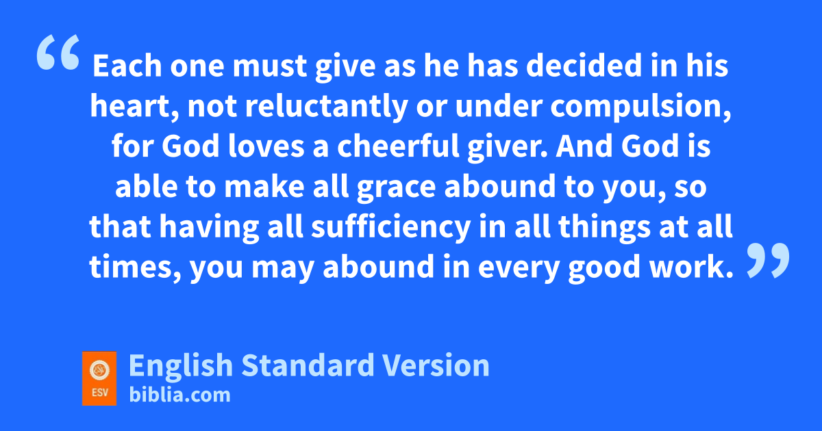 6 The point is this: vwhoever sows sparingly will also reap sparingly, and whoever sows bountifully4 will also reap bountifully. 7 Each one must give as he has decided in his heart, wnot reluctantly or under compulsion, for xGod loves a cheerful giver. 8 And yGod is able to make all grace abound to you, so that having all sufficiency5 in all things at all times, you may abound in every good work. 9 As it is written,