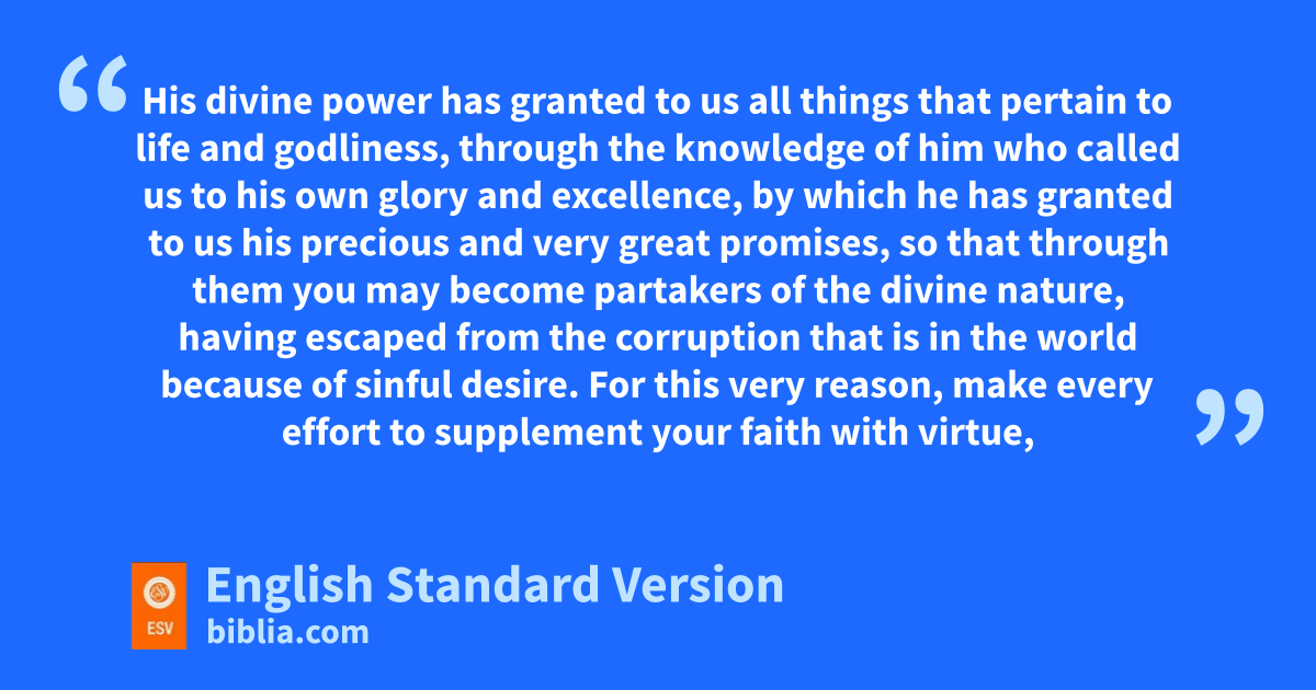 3 His divine power has granted to us all things that pertain to life and godliness, through the knowledge of him fwho called us to3 his own glory and excellence,4 4 by which he has granted to us his precious and very great promises, so that through them you may become gpartakers of the divine nature, hhaving escaped from the corruption that is in the world because of sinful desire. 5 For this very reason, make every effort to supplement your faith iwith virtue,5 and virtue jwith knowledge, 6 and knowledge with self-control, and self-control kwith steadfastness, and steadfastness with godliness, 7 and godliness lwith brotherly affection, and brotherly affection mwith love. 8 For if these qualities6 are yours and are increasing, they keep you from being ineffective or nunfruitful in the knowledge of our Lord Jesus Christ. 9 For whoever lacks these qualities is so nearsighted that he ois blind, having forgotten that he was pcleansed from his former sins. 10 Therefore, brothers,7 be all the more diligent to confirm your calling and qelection, for if you practice these qualities ryou will never fall. 11 For in this way there will be richly provided for you san entrance into the eternal kingdom of our Lord and Savior Jesus Christ.