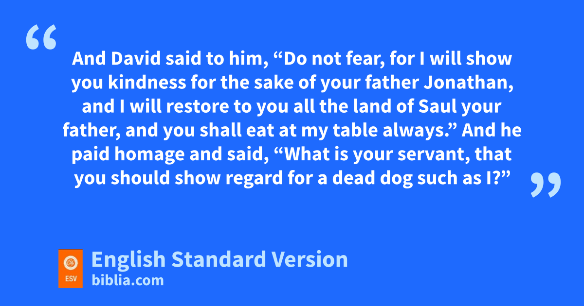 9 And David said, “Is there still anyone left of the house of Saul, that I may ishow him kindness for Jonathan’s sake?” 2 Now there was a servant of the house of Saul whose name was jZiba, and they called him to David. And the king said to him, “Are you Ziba?” And he said, “I am your servant.” 3 And the king said, “Is there not still someone of the house of Saul, that I may show kthe kindness of God to him?” Ziba said to the king, “There is still a son of lJonathan; he is crippled in his feet.” 4 The king said to him, “Where is he?” And Ziba said to the king, “He is in the house of mMachir the son of Ammiel, at Lo-debar.” 5 Then King David sent and brought him from the house of Machir the son of Ammiel, at Lo-debar. 6 And nMephibosheth the son of Jonathan, son of Saul, came to David and fell on his face and paid homage. And David said, “Mephibosheth!” And he answered, “Behold, I am your servant.” 7 And David said to him, “Do not fear, ifor I will show you kindness for the sake of your father Jonathan, and I will restore to you all the land of Saul your father, and oyou shall eat at my table always.” 8 And he paid homage and said, “What is your servant, that you should show regard for pa dead dog such as I?”