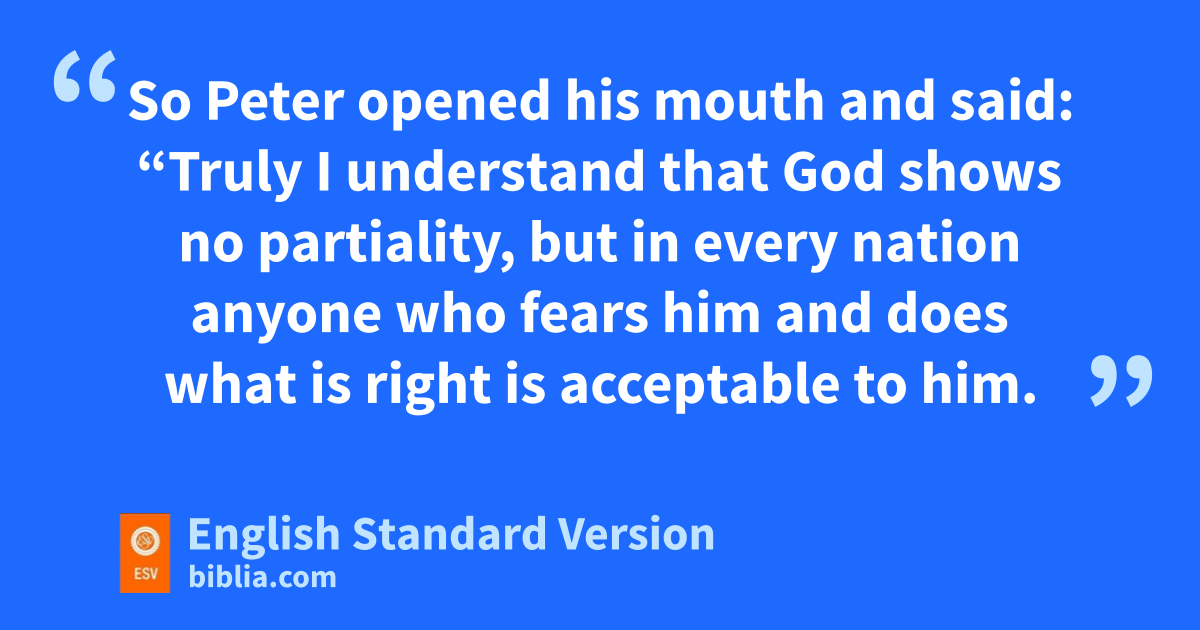 34 So Peter opened his mouth and said: “Truly I understand that fGod gshows no partiality, 35 but fin every nation anyone who fears him and hdoes what is right is acceptable to him. 36 As for ithe word that he sent to Israel, jpreaching good news of kpeace through Jesus Christ (lhe is Lord of all), 37 you yourselves know what happened throughout all Judea, mbeginning nfrom Galilee after the baptism that John proclaimed: 38 how oGod anointed Jesus of Nazareth pwith the Holy Spirit and with qpower. He went about doing good and healing all rwho were oppressed by the devil, sfor God was with him. 39 And twe are witnesses of all that he did both in the country of the Jews and in Jerusalem. uThey put him to death by hanging him on a tree, 40 but vGod raised him on wthe third day and made him to xappear, 41 ynot to all the people but to us who had been chosen by God as zwitnesses, who ate and drank with him after he rose from the dead. 42 And ahe commanded us to preach to the people and to testify bthat he is the one appointed by God to be judge cof the living and the dead. 43 dTo him eall the prophets bear witness that feveryone who believes in him receives gforgiveness of sins hthrough his name.”