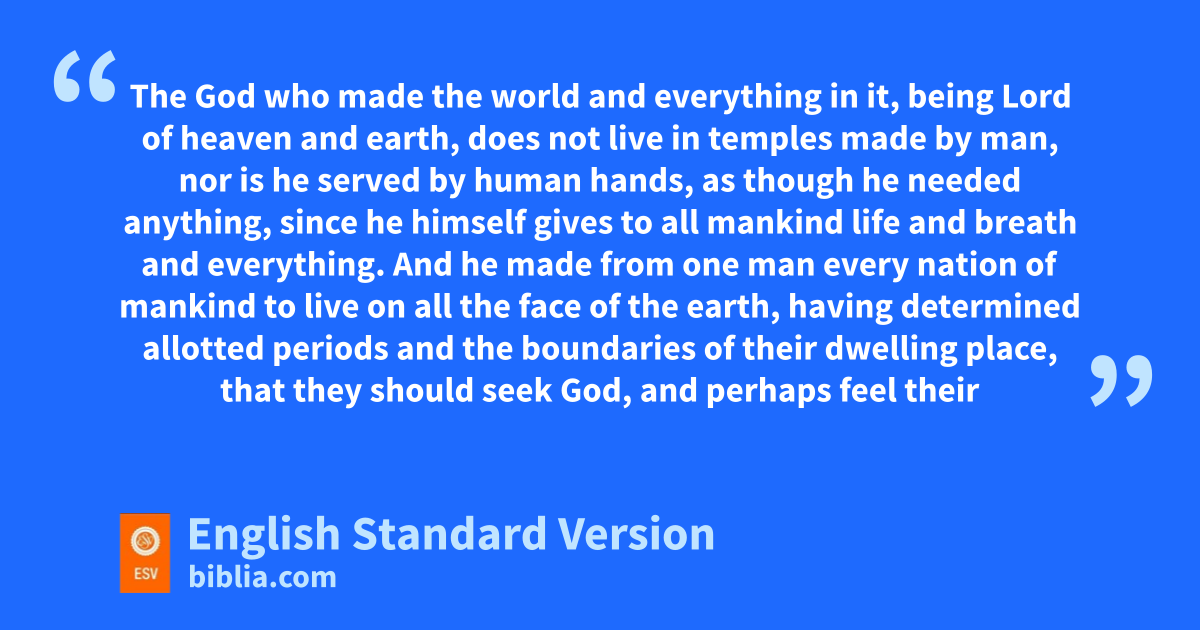22 So Paul, standing in the midst of the Areopagus, said: “Men of Athens, I perceive that in every way you are very religious. 23 For as I passed along and observed the objects of your worship, I found also an altar with this inscription: p‘To the unknown god.’ pWhat therefore you worship qas unknown, this I proclaim to you. 24 rThe God who made the world and everything in it, being sLord of heaven and earth, tdoes not live in temples made by man,3 25 nor is he served by human hands, uas though he needed anything, since he himself vgives to all mankind wlife and breath and everything. 26 And xhe made from one man every nation of mankind to live yon all the face of the earth, zhaving determined allotted periods and athe boundaries of their dwelling place, 27 bthat they should seek God, cand perhaps feel their way toward him and find him. dYet he is actually not far from each one of us, 28 for