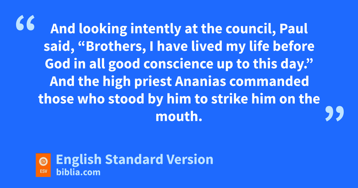 23 And looking intently at the council, Paul said, “Brothers, xI have lived my life before God in all good conscience up to this day.” 2 And the high priest yAnanias commanded those who stood by him zto strike him on the mouth. 3 Then Paul said to him, “God is going to strike you, you awhitewashed bwall! Are you sitting to judge me according to the law, and yet ccontrary to the law you corder me to be struck?” 4 Those who stood by said, “Would you revile dGod’s high priest?” 5 And Paul said, e“I did not know, brothers, that he was the high priest, for it is written, f‘You shall not speak evil of a ruler of your people.’ ”