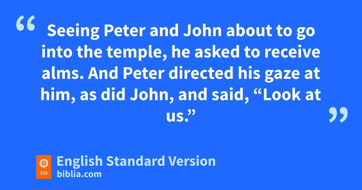 3 Now Peter and John were ogoing up to the temple at pthe hour of prayer, qthe ninth hour.1 2 And a man rlame from birth was being carried, swhom they laid daily at the gate of the temple that is called the Beautiful Gate tto ask alms of those entering the temple. 3 Seeing Peter and John about to go into the temple, he asked to receive alms. 4 And Peter directed his gaze at him, as did John, and said, “Look at us.” 5 And he fixed his attention on them, expecting to receive something from them. 6 But Peter said, u“I have no silver and gold, but what I do have I give to you. vIn the name of Jesus Christ of Nazareth, rise up and walk!” 7 And he took him by the right hand and raised him up, and immediately his feet and ankles were made strong. 8 And wleaping up, he stood and began to walk, and entered the temple with them, walking and leaping and praising God. 9 And xall the people saw him walking and praising God, 10 and recognized him as the one who sat at the Beautiful Gate of the temple, asking for alms. And they were filled with wonder and amazement at what had happened to him.
