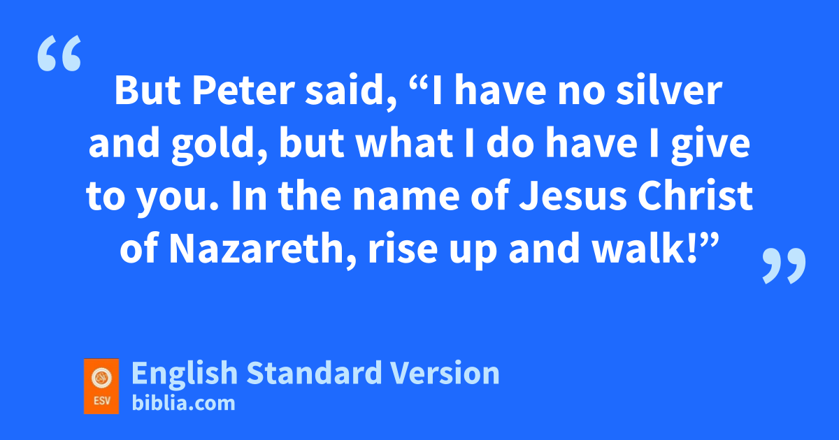 3 Now Peter and John were ogoing up to the temple at pthe hour of prayer, qthe ninth hour.1 2 And a man rlame from birth was being carried, swhom they laid daily at the gate of the temple that is called the Beautiful Gate tto ask alms of those entering the temple. 3 Seeing Peter and John about to go into the temple, he asked to receive alms. 4 And Peter directed his gaze at him, as did John, and said, “Look at us.” 5 And he fixed his attention on them, expecting to receive something from them. 6 But Peter said, u“I have no silver and gold, but what I do have I give to you. vIn the name of Jesus Christ of Nazareth, rise up and walk!” 7 And he took him by the right hand and raised him up, and immediately his feet and ankles were made strong. 8 And wleaping up, he stood and began to walk, and entered the temple with them, walking and leaping and praising God. 9 And xall the people saw him walking and praising God, 10 and recognized him as the one who sat at the Beautiful Gate of the temple, asking for alms. And they were filled with wonder and amazement at what had happened to him.