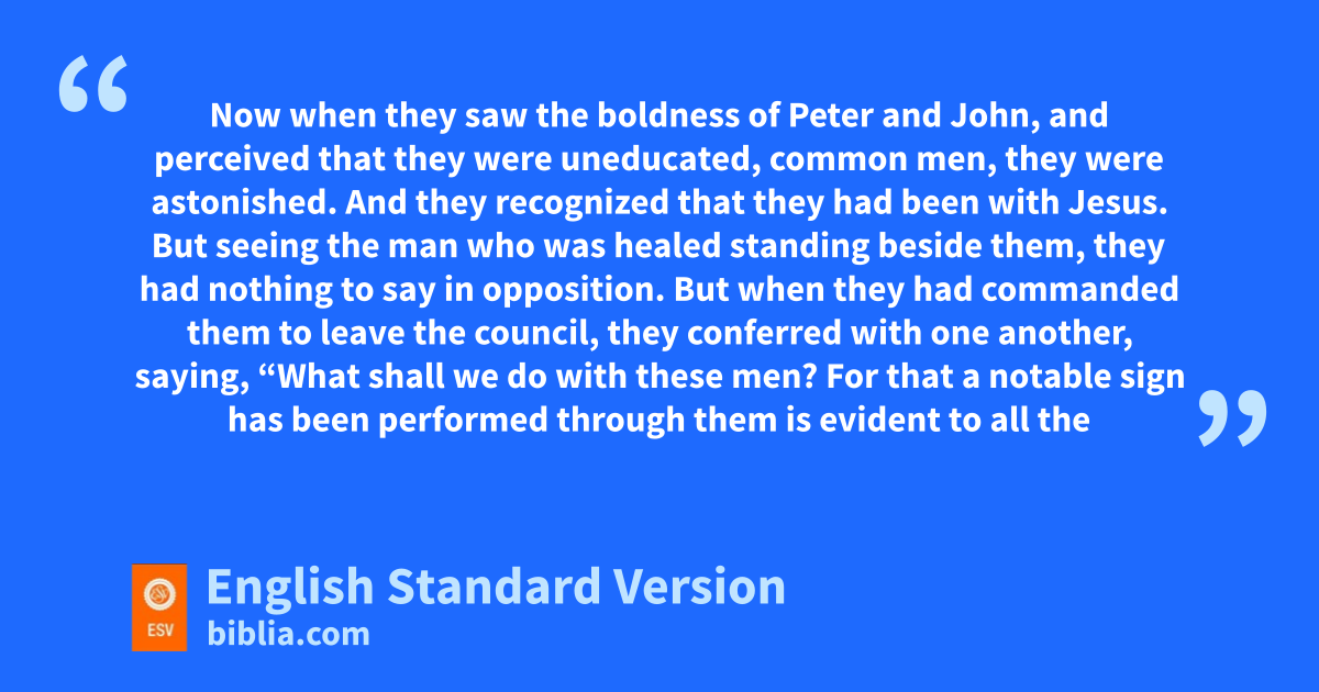 13 eNow when they saw the boldness of Peter and John, and perceived that they were uneducated, common men, they were astonished. And they recognized that they had been with Jesus. 14 But seeing the man who was healed fstanding beside them, gthey had nothing to say in opposition. 15 But when they had commanded them to leave the council, they conferred with one another, 16 saying, h“What shall we do with these men? For that ia notable sign has been performed through them is evident to all the inhabitants of Jerusalem, and we cannot deny it. 17 But in order that it may spread no further among the people, let us warn them jto speak no more to anyone in this name.” 18 So they called them and charged them not to speak or teach at all in the name of Jesus. 19 But Peter and John answered them, k“Whether it is right in the sight of God to listen to you rather than to God, you must judge, 20 for lwe cannot but speak of what mwe have seen and heard.” 21 And when they had further threatened them, they let them go, finding no way to punish them, nbecause of the people, for all were praising God ofor what had happened. 22 For the man on whom this sign of healing was performed was more than forty years old.