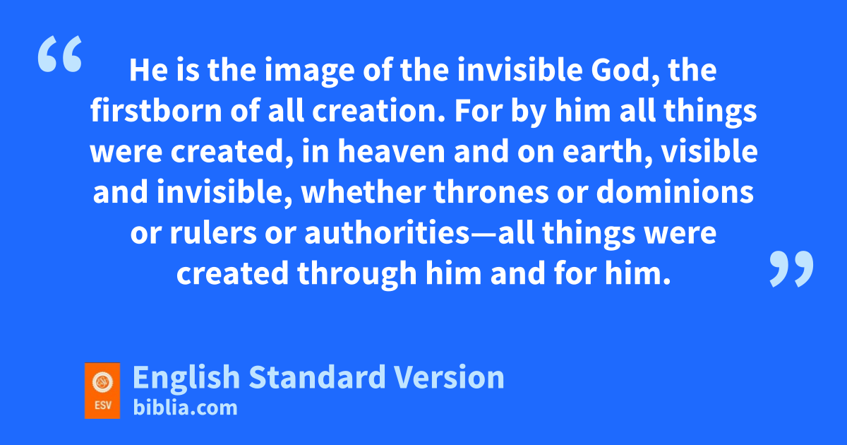 15 iHe is the image of jthe invisible God, kthe firstborn of all creation. 16 For by6 him all things were created, lin heaven and on earth, visible and invisible, whether mthrones or ndominions or rulers or authorities—all things were created othrough him and for him. 17 And phe is before all things, and in him all things qhold together. 18 And rhe is the head of the body, the church. He is sthe beginning, tthe firstborn from the dead, that in everything he might be preeminent. 19 For uin him all the vfullness of God was pleased to dwell, 20 and wthrough him to reconcile to himself all things, whether on earth or in heaven, xmaking peace yby the blood of his cross.