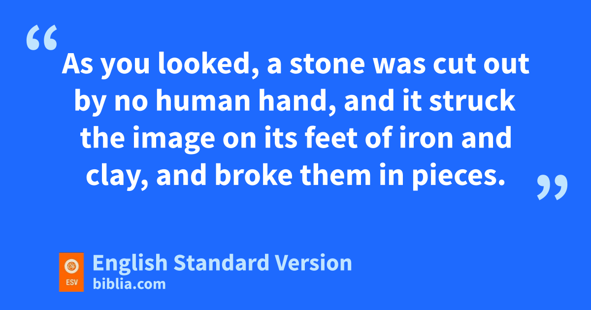 31 “You saw, O king, and behold, a great image. This image, mighty and of exceeding brightness, stood before you, and its appearance was frightening. 32 iThe head of this image was of fine gold, jits chest and arms of silver, its middle and jthighs of bronze, 33 kits legs of iron, its feet partly of iron and partly of clay. 34 As you looked, a stone was cut out lby no human hand, and it struck the image on its feet of iron and clay, and mbroke them in pieces. 35 Then the iron, the clay, the bronze, the silver, and the gold, all together were broken in pieces, and became nlike the chaff of the summer threshing floors; and the wind carried them away, so that onot a trace of them could be found. But the stone that struck the image became pa great mountain qand filled the whole earth.