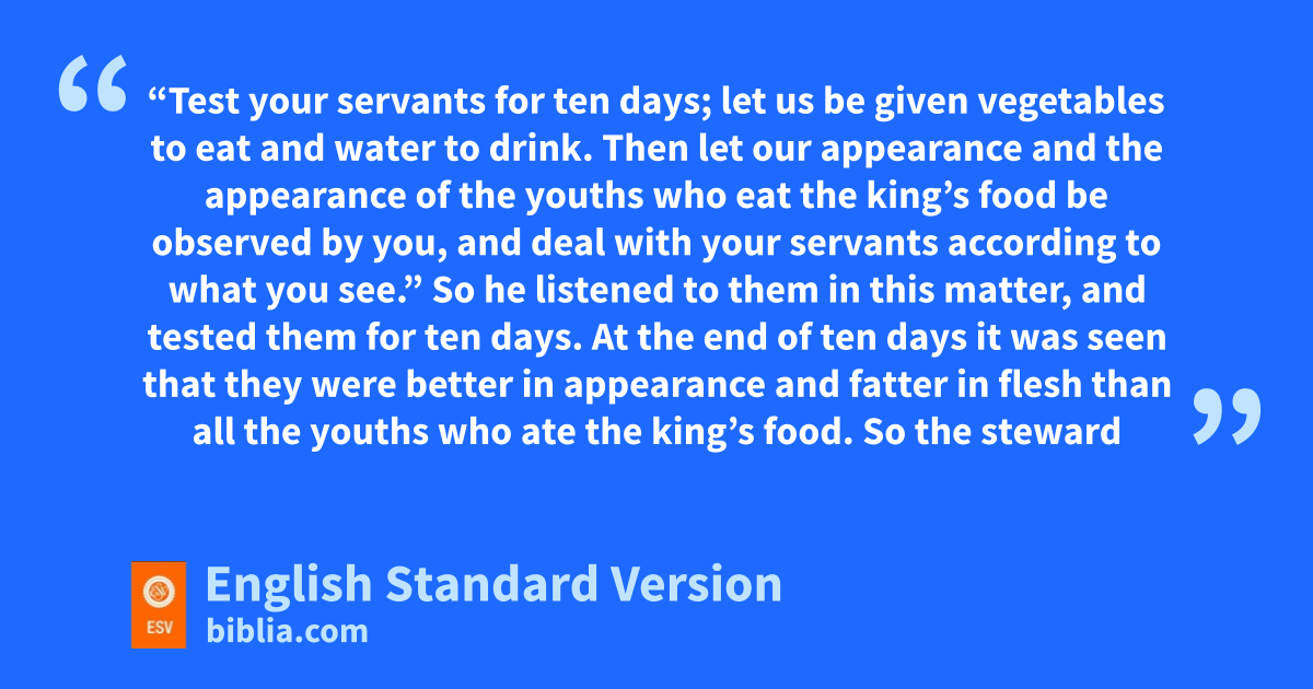 8 But Daniel sresolved that he would not tdefile himself with kthe king’s food, or with lthe wine that he drank. Therefore he asked the chief of the eunuchs to allow him not to tdefile himself. 9 uAnd God gave Daniel favor and compassion in the sight of the chief of the eunuchs, 10 and the chief of the eunuchs said to Daniel, “I fear my lord the king, who assigned your food and your drink; for why should he see that you were in worse condition than the youths who are of your own age? So you would endanger my head with the king.” 11 Then Daniel said to the steward whom the chief of the eunuchs had assigned over Daniel, Hananiah, Mishael, and Azariah, 12 “Test your servants for vten days; let us be given vegetables to eat and water to drink. 13 Then let our appearance and the appearance of the youths who eat kthe king’s food be observed by you, and deal with your servants according to what you see.” 14 So he listened to them in this matter, and tested them for ten days. 15 At the end of ten days it was seen that they were better in appearance and fatter in flesh than all the youths who ate kthe king’s food. 16 wSo the steward took away their food and the wine they were to drink, and gave them xvegetables.