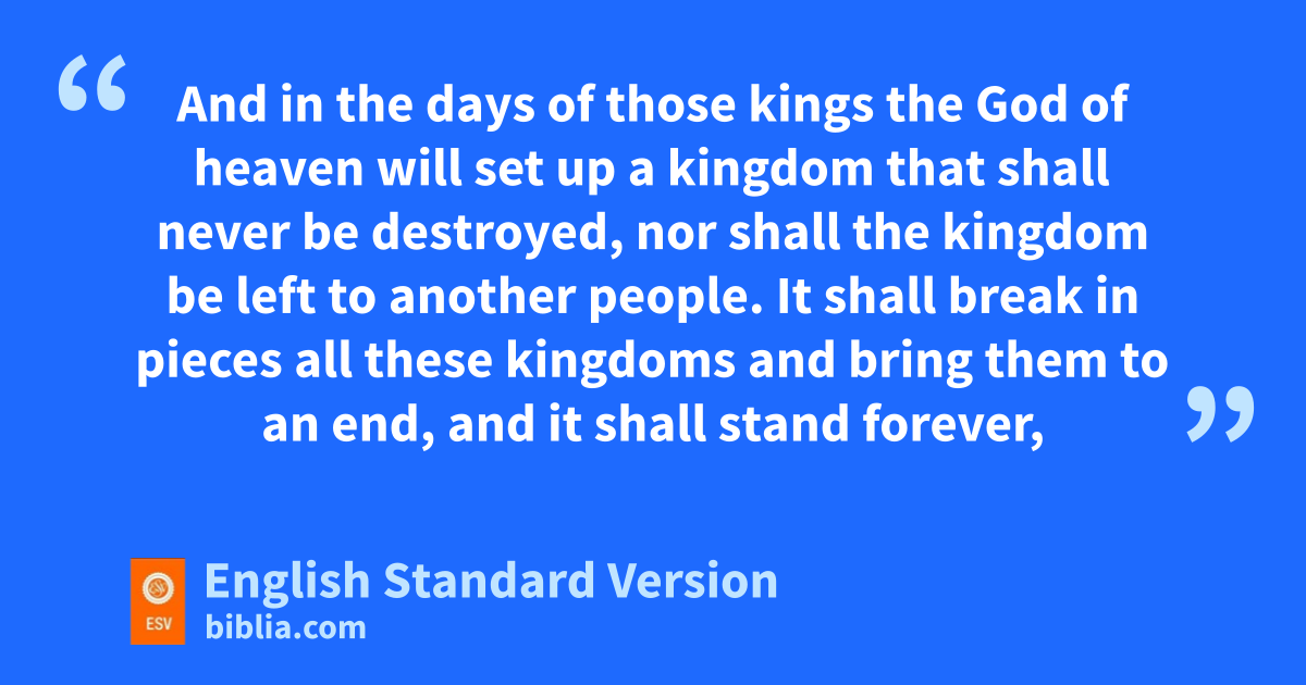 36 “This was the dream. Now we will tell the king its interpretation. 37 You, O king, rthe king of kings, to whom sthe God of heaven thas given the kingdom, the power, and the might, and the glory, 38 and into whose hand he has given, wherever they dwell, the children of man, uthe beasts of the field, and the birds of the heavens, making you rule over them all—you are vthe head of gold. 39 wAnother kingdom inferior to you shall arise after you, and yet a third kingdom vof bronze, xwhich shall rule over all the earth. 40 And ythere shall be a fourth kingdom, strong as iron, because iron zbreaks to pieces and shatters all things. And like iron that crushes, it shall zbreak and crush all these. 41 And as you saw athe feet and toes, partly of potter’s clay and partly of iron, it shall be a divided kingdom, but some of the yfirmness of iron shall be in it, just as you saw iron mixed with the soft clay. 42 And as the toes of the feet were partly iron and partly clay, so the kingdom shall be partly strong and partly brittle. 43 As you saw the iron mixed with soft clay, so they will mix with one another in marriage,3 but they will not hold together, just as iron does not mix with clay. 44 And in the days of those kings bthe God of heaven will set up ca kingdom that shall never be destroyed, nor shall the kingdom be left to another people. dIt shall break in pieces all these kingdoms and bring them to an end, and cit shall stand forever, 45 just as eyou saw that fa stone was cut from a mountain by no human hand, and that dit broke in pieces the iron, the bronze, the clay, the silver, and the gold. A ggreat God has made known to the king what shall be after this. The dream is certain, and its interpretation sure.”
