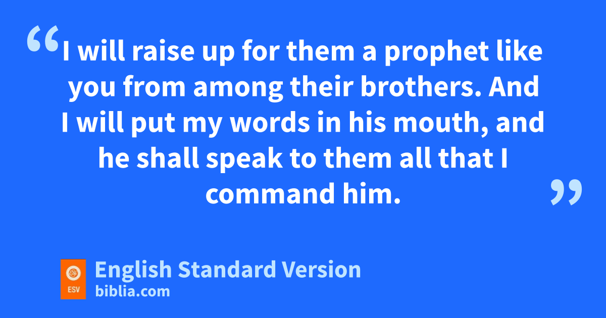 15 f“The Lord your God will raise up for you a prophet like me from among you, from your brothers—it is to him you shall listen— 16 just as you desired of the Lord your God at Horeb gon the day of the assembly, when you said, h‘Let me not hear again the voice of the Lord my God or see this great fire any more, lest I die.’ 17 And the Lord said to me, i‘They are right in what they have spoken. 18 fI will raise up for them a prophet like you from among their brothers. jAnd I will put my words in his mouth, and khe shall speak to them all that I command him. 19 lAnd whoever will mnot listen to my words that he shall speak in my name, I myself will require it of him. 20 nBut the prophet who presumes to speak a word in my name that I have not commanded him to speak, or6 who speaks in the name of other gods, that same prophet shall die.’ 21 And if you say in your heart, ‘How may we know the word that the Lord has not spoken?’— 22 owhen a prophet speaks in the name of the Lord, if the word does not come to pass or come true, that is a word that the Lord has not spoken; nthe prophet has spoken it presumptuously. You need not be afraid of him.
