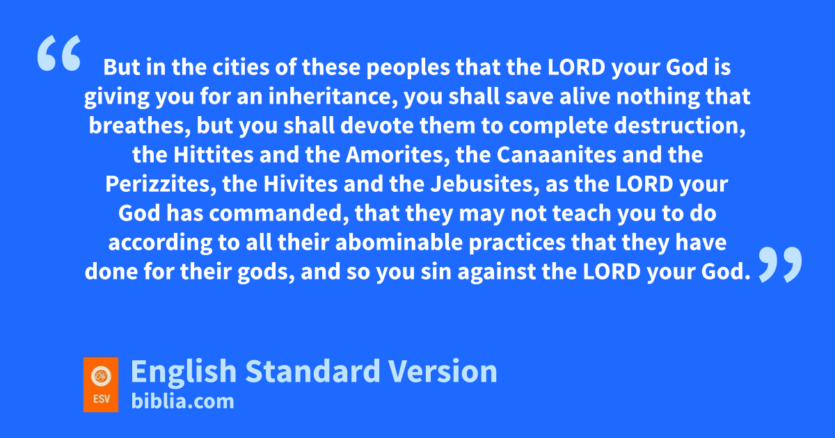 10 “When you draw near to a city to fight against it, poffer terms of peace to it. 11 And if it responds to you peaceably and it opens to you, then all the people who are found in it shall do forced labor for you and shall serve you. 12 But if it makes no peace with you, but makes war against you, then you shall besiege it. 13 And when the Lord your God gives it into your hand, qyou shall put all its males to the sword, 14 rbut the women and the little ones, the livestock, and everything else in the city, all its spoil, you sshall take as plunder for yourselves. And tyou shall enjoy the spoil of your enemies, which the Lord your God has given you. 15 Thus you shall do to all the cities that are very far from you, which are not cities of the nations here. 16 But uin the cities of these peoples that the Lord your God is giving you for an inheritance, you shall save alive nothing that breathes, 17 but vyou shall devote them to complete destruction,1 the Hittites and the Amorites, the Canaanites and the Perizzites, the Hivites and the Jebusites, as the Lord your God has commanded, 18 that wthey may not teach you to do according to all their abominable practices that they have done for their gods, and so you xsin against the Lord your God.