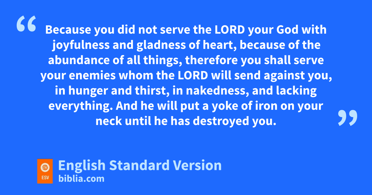 45 v“All these curses shall come upon you and pursue you and overtake you till you are destroyed, because you did not obey the voice of the Lord your God, to keep his commandments and his statutes that he commanded you. 46 They shall be wa sign and a wonder against you and your offspring forever. 47 xBecause you did not serve the Lord your God with joyfulness and gladness of heart, because of the abundance of all things, 48 therefore you shall serve your enemies whom the Lord will send against you, in hunger and thirst, in nakedness, and lacking everything. And he ywill put a yoke of iron on your neck until he has destroyed you. 49 zThe Lord will bring a nation against you from far away, from the end of the earth, aswooping down like the eagle, a nation bwhose language you do not understand, 50 a hard-faced nation cwho shall not respect the old or show mercy to the young. 51 It shall deat the offspring of your cattle and the fruit of your ground, until you are destroyed; it also shall not leave you grain, wine, or oil, the increase of your herds or the young of your flock, until they have caused you to perish.
