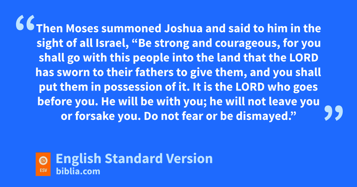 7 Then oMoses summoned Joshua and said to him in the sight of all Israel, l“Be strong and courageous, for you shall go with this people into the land that the Lord has sworn to their fathers to give them, and you shall put them in possession of it. 8 It is the Lord pwho goes before you. He will be with you; nhe will not leave you or forsake you. qDo not fear or be dismayed.”