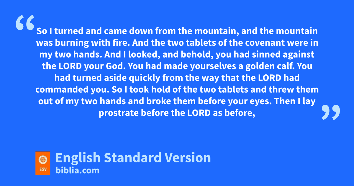13 p“Furthermore, the Lord said to me, ‘I have seen this people, and behold, it is ga stubborn people. 14 qLet me alone, that I may destroy them and rblot out their name from under heaven. And sI will make of you a nation mightier and greater than they.’ 15 tSo I turned and came down from the mountain, and uthe mountain was burning with fire. And the two tablets of the covenant were in my two hands. 16 And vI looked, and behold, you had sinned against the Lord your God. You had made yourselves a golden1 calf. wYou had turned aside quickly from the way that the Lord had commanded you. 17 So I took hold of the two tablets and threw them out of my two hands and broke them before your eyes. 18 Then I xlay prostrate before the Lord yas before, forty days and forty nights. I neither ate bread nor drank water, because of all the sin that you had committed, zin doing what was evil in the sight of the Lord to provoke him to anger. 19 For I was afraid of the anger and hot displeasure that the Lord bore against you, so that he was ready to destroy you. aBut the Lord listened to me that time also. 20 And the Lord was so angry with Aaron that he was ready to destroy him. And I prayed for Aaron also at the same time. 21 Then bI took the sinful thing, the calf that you had made, and burned it with fire and crushed it, grinding it very small, until it was as fine as dust. And I threw the dust of it into the brook that ran down from the mountain.