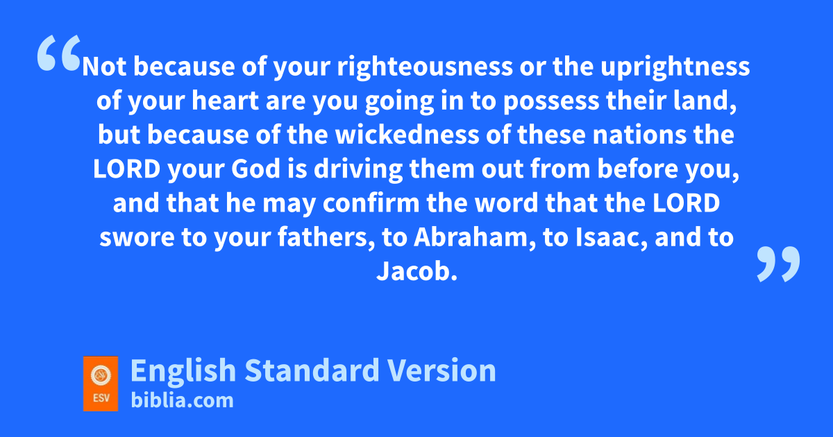 4 c“Do not say in your heart, after the Lord your God has thrust them out before you, ‘It is because of my righteousness that the Lord has brought me in to possess this land,’ whereas it is dbecause of the wickedness of these nations that the Lord is driving them out before you. 5 eNot because of your righteousness or the uprightness of your heart are you going in to possess their land, but because of the wickedness of these nations the Lord your God is driving them out from before you, and that he may confirm fthe word that the Lord swore to your fathers, to Abraham, to Isaac, and to Jacob.
