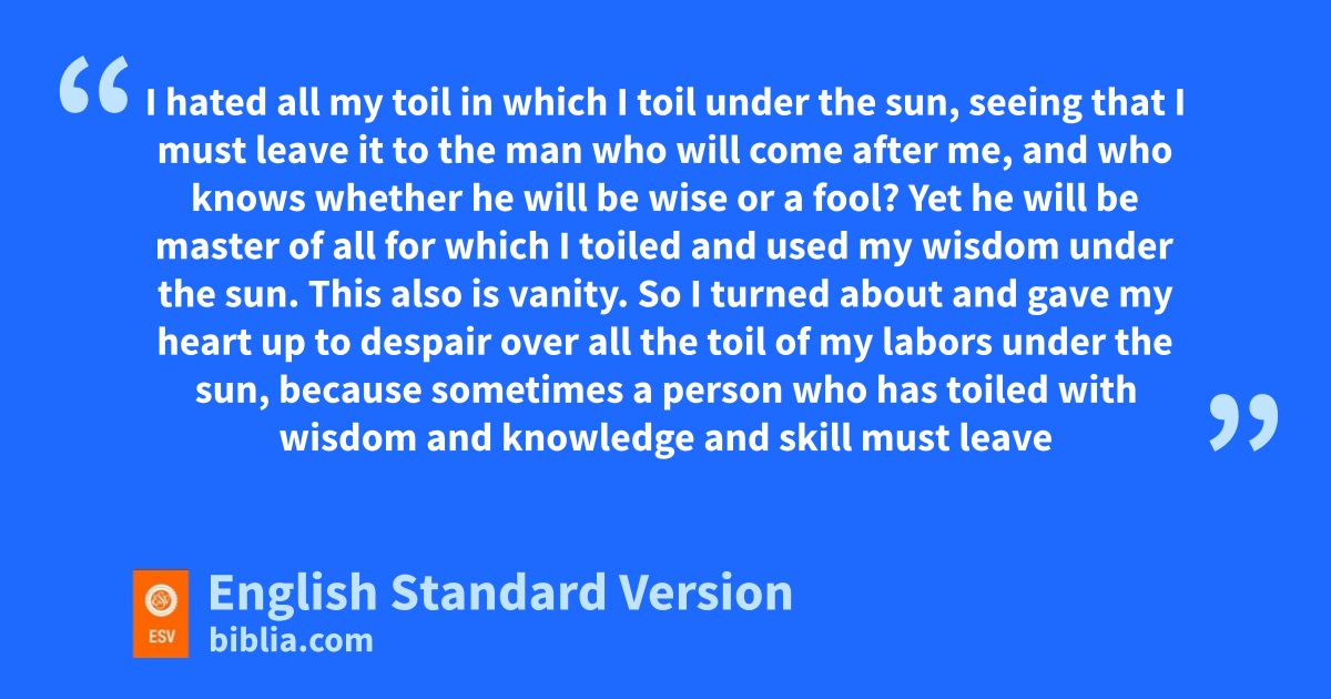 18 I hated yall my toil in which I toil under the sun, seeing that I must zleave it to the man who will come after me, 19 and who knows whether he will be wise or a fool? Yet he will be master of all for which I toiled and used my wisdom under the sun. This also is vanity. 20 So I aturned about and gave my heart up to despair bover all the toil of my labors under the sun, 21 because sometimes a person who has toiled with wisdom and knowledge and skill must leave everything to be enjoyed by someone who did not toil for it. This also is vanity and a great evil. 22 What has a man from call the toil and striving of heart with which he toils beneath the sun? 23 For dall his days are full of sorrow, and his ework is a vexation. Even in the night his heart does not rest. This also is vanity.