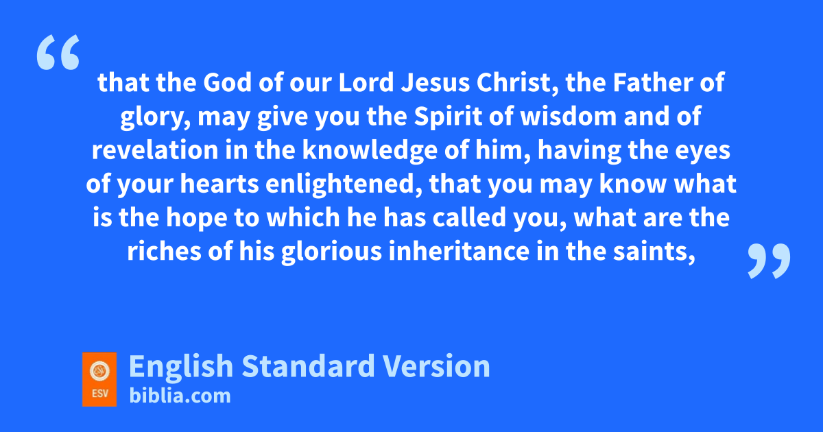 15 For this reason, mbecause I have heard of your faith in the Lord Jesus and your love7 toward all the saints, 16 I ndo not cease to give thanks for you, oremembering you in my prayers, 17 that pthe God of our Lord Jesus Christ, the Father of glory, qmay give you the Spirit of wisdom and of revelation in the knowledge of him, 18 rhaving the eyes of your hearts enlightened, that you may know what is sthe hope to which he has called you, what are tthe riches of his glorious inheritance in the saints, 19 and what is the immeasurable greatness of his power toward us who believe, uaccording to the working of vhis great might 20 that he worked in Christ wwhen he raised him from the dead and xseated him at his right hand yin the heavenly places, 21 zfar above aall rule and authority and power and dominion, and above bevery name that is named, not only in cthis age but also in the one to come. 22 And dhe put all things under his feet and gave him as ehead over all things to the church, 23 fwhich is his body, gthe fullness of him hwho fills iall in all.
