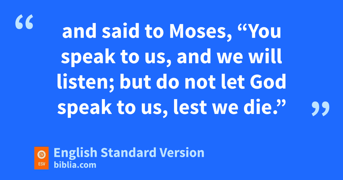 18 Now when all the people saw wthe thunder and the flashes of lightning and the sound of the trumpet and the mountain smoking, the people were afraid4 and trembled, and they stood far off 19 and said to Moses, x“You speak to us, and we will listen; but do not let God speak to us, lest we die.” 20 yMoses said to the people, “Do not fear, for God has come to ztest you, that the fear of him may be before you, that you may not sin.” 21 The people stood far off, while Moses drew near to the athick darkness where God was.