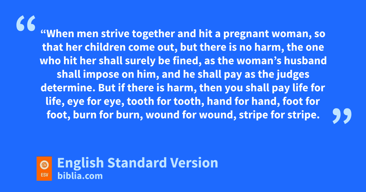 22 “When men strive together and hit a pregnant woman, so that her children come out, but there is no harm, the one who hit her shall surely be fined, as the woman’s husband shall impose on him, and vhe shall pay as the wjudges determine. 23 But if there is harm,4 then you shall pay xlife for life, 24 yeye for eye, tooth for tooth, hand for hand, foot for foot, 25 burn for burn, wound for wound, stripe for stripe.