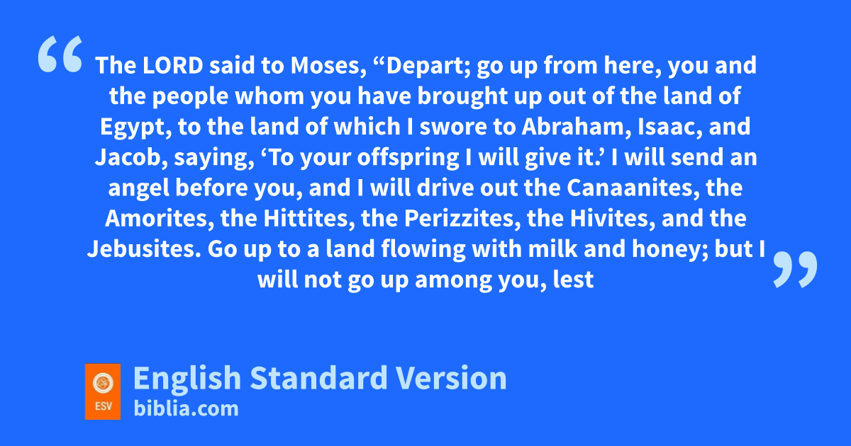 33 The Lord said to Moses, “Depart; go up from here, you oand the people whom you have brought up out of the land of Egypt, to the land of which I swore to Abraham, Isaac, and Jacob, saying, ‘To pyour offspring I will give it.’ 2 I will send an qangel before you, rand I will drive out the Canaanites, the Amorites, the Hittites, the Perizzites, the Hivites, and the Jebusites. 3 sGo up to a land flowing with milk and honey; tbut I will not go up among you, ulest I consume you on the way, for you are a vstiff-necked people.”