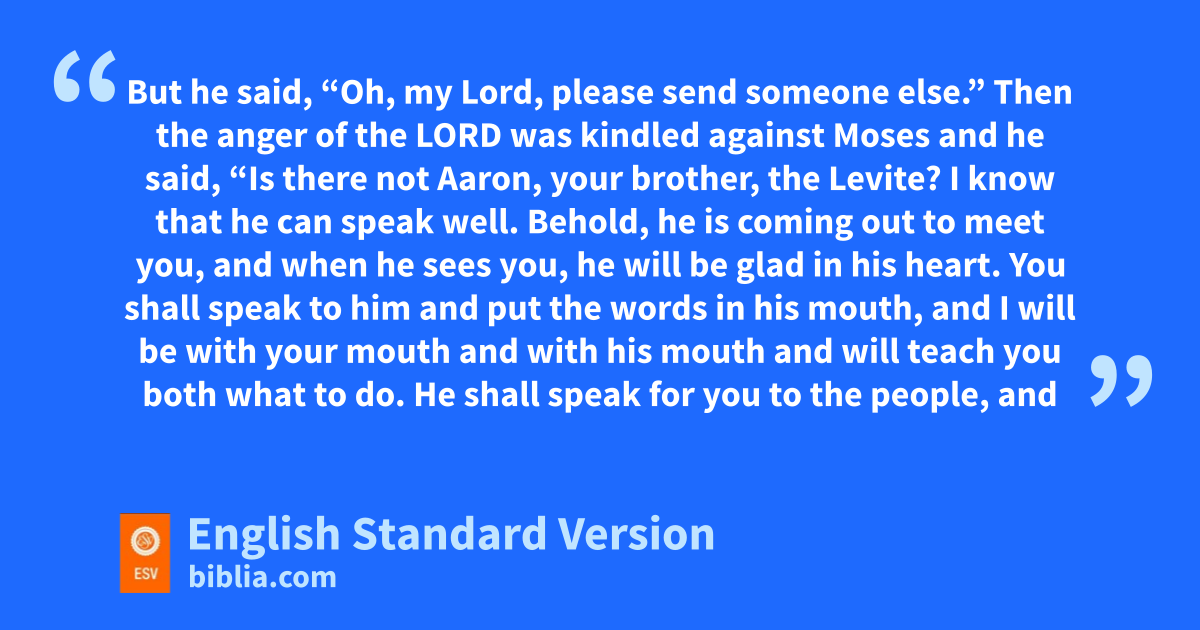 10 But Moses said to the Lord, “Oh, my Lord, I am not eloquent, either in the past or since you have spoken to your servant, but oI am slow of speech and of tongue.” 11 Then the Lord said to him, “Who has made man’s mouth? Who makes him mute, or deaf, or seeing, or blind? Is it not I, the Lord? 12 Now therefore go, and pI will be with your mouth and teach you what you shall speak.” 13 But he said, “Oh, my Lord, please send someone else.” 14 Then the anger of the Lord was kindled against Moses and he said, “Is there not Aaron, your brother, the Levite? I know that he can speak well. Behold, qhe is coming out to meet you, and when he sees you, he will be glad in his heart. 15 rYou shall speak to him and sput the words in his mouth, and pI will be with your mouth and with his mouth and will teach you both what to do. 16 tHe shall speak for you to the people, and he shall be your mouth, and uyou shall be as God to him. 17 And take in your hand vthis staff, with which you shall do the signs.”
