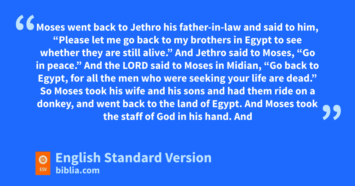 18 Moses went back to wJethro his father-in-law and said to him, “Please let me go back to my brothers in Egypt to see whether they are still alive.” And Jethro said to Moses, “Go in peace.” 19 And the Lord said to Moses in Midian, “Go back to Egypt, for xall the men who were seeking your life are dead.” 20 So Moses took yhis wife and his sons and had them ride on a donkey, and went back to the land of Egypt. And Moses took zthe staff of God in his hand.