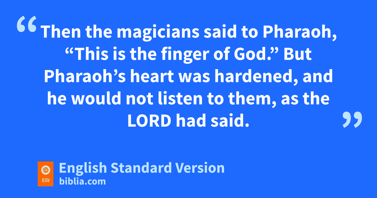 16 Then the Lord said to Moses, “Say to Aaron, a‘Stretch out your staff and strike the dust of the earth, so that it may become gnats in all the land of Egypt.’ ” 17 And they did so. Aaron stretched out his hand with his staff and struck the dust of the earth, and bthere were gnats on man and beast. All the dust of the earth became gnats in all the land of Egypt. 18 The cmagicians tried by their secret arts to produce gnats, but they could not. So there were gnats on man and beast. 19 Then the magicians said to Pharaoh, “This is dthe finger of God.” But Pharaoh’s heart was hardened, and he would not listen to them, as the Lord had said.