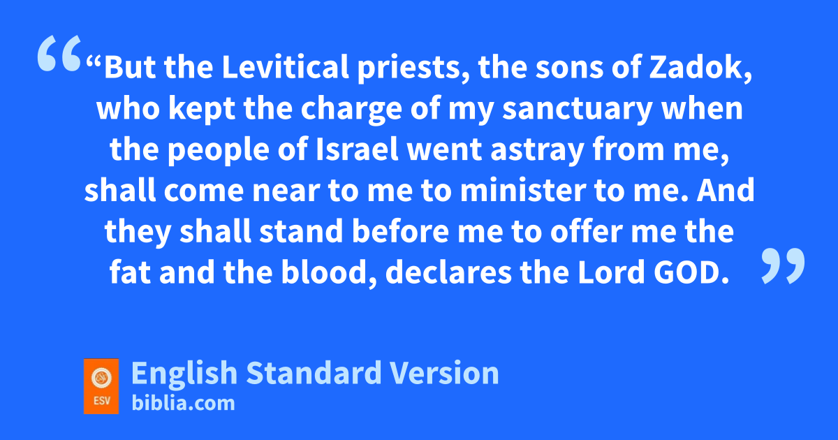 15 “But cthe Levitical priests, cthe sons of Zadok, who kept athe charge of my sanctuary rwhen the people of Israel went astray from me, shall come near to me dto minister to me. And they shall stand before me to offer me ethe fat and the blood, declares the Lord God. 16 They shall enter my sanctuary, and they shall approach fmy table, to minister to me, and they shall keep my charge. 17 When they enter the gates of the inner court, they shall wear glinen garments. They shall have nothing of wool on them, while they minister at the gates of the inner court, and within. 18 They shall have linen turbans on their heads, and linen undergarments around their waists. They shall not bind themselves with anything that causes sweat. 19 And when they go out into the outer court to the people, they shall put off the garments in which they have been ministering hand lay them in the holy chambers. And ithey shall put on other garments, jlest they transmit holiness to the people with their garments. 20 kThey shall not shave their heads or llet their locks grow long; they shall surely trim the hair of their heads. 21 mNo priest shall drink wine when he enters the inner court. 22 nThey shall not marry a widow or a divorced woman, but only virgins of the offspring of the house of Israel, or a widow who is the widow of a priest. 23 oThey shall teach my people the difference between the holy and the common, and oshow them how to distinguish between the unclean and the clean. 24 pIn a dispute, they shall act as judges, and they shall judge it according to my judgments. They shall keep my laws and my statutes in all my appointed feasts, and qthey shall keep my Sabbaths holy. 25 rThey shall not defile themselves by going near to a dead person. However, for father or mother, for son or daughter, for brother or unmarried sister they may defile themselves. 26 sAfter he4 has become clean, they shall count seven days for him. 27 And on the day that he goes into the Holy Place, tinto the inner court, to minister in the Holy Place, uhe shall offer his sin offering, declares the Lord God.