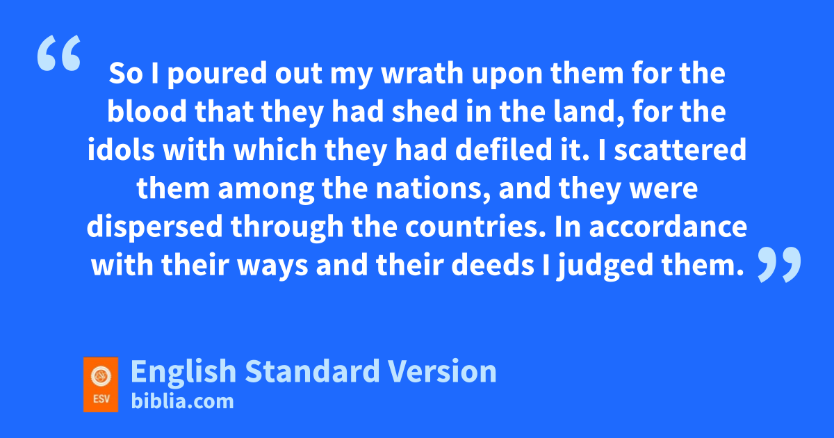 16 The word of the Lord came to me: 17 o“Son of man, when the house of Israel lived in their own land, pthey defiled it by their ways and their deeds. Their ways before me were qlike the uncleanness of a woman in her menstrual impurity. 18 So rI poured out my wrath upon them sfor the blood that they had shed in the land, for the idols twith which they had defiled it. 19 uI scattered them among the nations, and they were dispersed through the countries. vIn accordance with their ways and their deeds I judged them. 20 But when they came to the nations, wherever they came, wthey profaned my holy name, in that people said of them, ‘These are the people of the Lord, and yet they had to go out of his land.’ 21 But I had concern xfor my holy name, which the house of Israel had profaned among the nations to which they came.