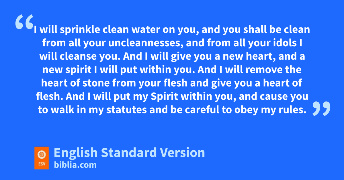 22 “Therefore say to the house of Israel, Thus says the Lord God: yIt is not for your sake, O house of Israel, that I am about to act, but for the sake of my holy name, wwhich you have profaned among the nations to which you came. 23 zAnd I will vindicate the holiness of my great name, which has been profaned among the nations, and which you have profaned among them. aAnd the nations will know that I am the Lord, declares the Lord God, when through you I vindicate my holiness before their eyes. 24 bI will take you cfrom the nations and gather you from all the countries and dbring you into your own land. 25 eI will sprinkle clean water on you, and you shall be clean from fall your uncleannesses, and gfrom all your idols hI will cleanse you. 26 And I will give you ia new heart, and ia new spirit I will put within you. iAnd I will remove the heart of stone from your flesh and give you a heart of flesh. 27 jAnd I will put my Spirit within you, iand cause you to walk in my statutes and kbe careful to obey my rules.1 28 lYou shall dwell in the land that I gave to your fathers, and myou shall be my people, and I will be your God. 29 And nI will deliver you from all your uncleannesses. And oI will summon the grain and make it abundant and play no famine upon you. 30 qI will make the fruit of the tree and the increase of the field abundant, othat you may never again suffer the disgrace of famine among the nations. 31 Then ryou will remember your evil ways, and your deeds that were not good, and you will loathe yourselves for your iniquities and your abominations. 32 yIt is not for your sake that I will act, declares the Lord God; let that be known to you. Be ashamed and confounded for your ways, O house of Israel.