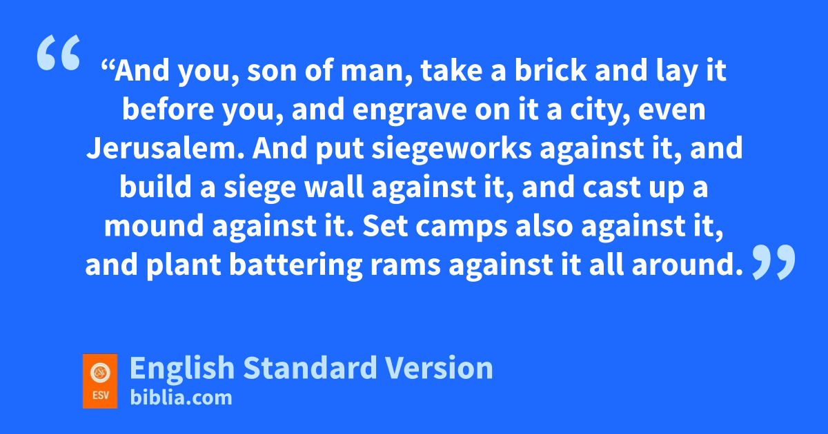 4 “And you, rson of man, stake a brick and lay it before you, and engrave on it a city, even Jerusalem. 2 tAnd put siegeworks against it, uand build a siege wall against it, vand cast up a mound against it. Set camps also against it, wand plant battering rams against it all around. 3 And you, take an iron griddle, and place it as an iron wall between you and the city; xand set your face toward it, yand let it be in a state of siege, and press the siege against it. This is za sign for the house of Israel.