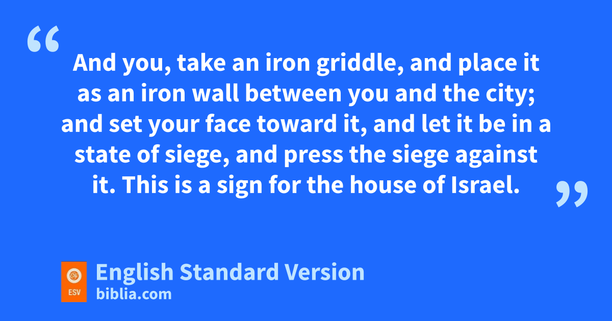 4 “And you, rson of man, stake a brick and lay it before you, and engrave on it a city, even Jerusalem. 2 tAnd put siegeworks against it, uand build a siege wall against it, vand cast up a mound against it. Set camps also against it, wand plant battering rams against it all around. 3 And you, take an iron griddle, and place it as an iron wall between you and the city; xand set your face toward it, yand let it be in a state of siege, and press the siege against it. This is za sign for the house of Israel.