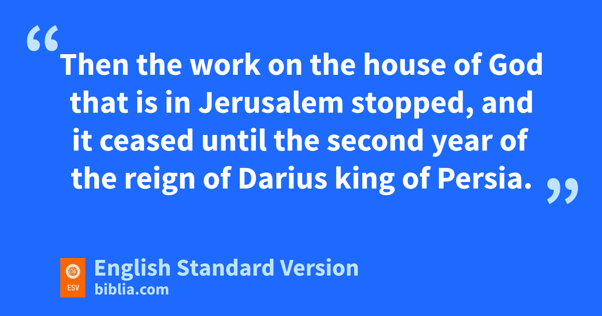 23 Then, when the copy of King Artaxerxes’ letter was read before Rehum and Shimshai the scribe and their associates, they went in haste to the Jews at Jerusalem and by force and power made them cease. 24 Then the work on the house of God that is in Jerusalem stopped, and it ceased until the second year of the reign of Darius king of Persia.