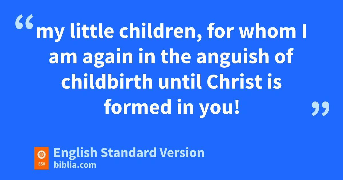 12 Brothers,3 tI entreat you, become as I am, for I also have become as you are. uYou did me no wrong. 13 You know it was vbecause of a bodily ailment that I preached the gospel to you wat first, 14 and though my condition was a trial to you, you did not scorn or despise me, but received me xas an angel of God, yas Christ Jesus. 15 What then has become of your blessedness? For I testify to you that, if possible, you would have gouged out your eyes and given them to me. 16 Have I then become your enemy by ztelling you the truth?4 17 They make much of you, but for no good purpose. They want to shut you out, that you may make much of them. 18 It is always good to be made much of for a good purpose, and anot only when I am present with you, 19 bmy little children, cfor whom I am again in the anguish of childbirth until Christ dis formed in you! 20 I wish I could be present with you now and change my tone, for I am perplexed about you.