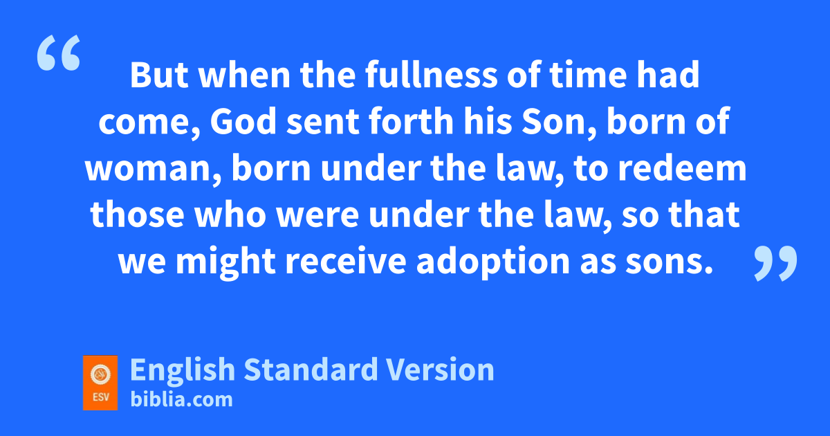 4 I mean that the heir, as long as he is a child, is no different from a slave,1 though he is the owner of everything, 2 but he is under guardians and managers until the date set by his father. 3 In the same way we also, when we were children, cwere enslaved to the elementary principles2 of the world. 4 But dwhen the fullness of time had come, God sent forth his Son, eborn fof woman, born gunder the law, 5 hto redeem those who were under the law, so that we might receive iadoption as sons. 6 And because you are sons, God has sent jthe Spirit of his Son into our hearts, crying, “Abba! Father!” 7 So you are no longer a slave, but a son, and if a son, then kan heir through God.
