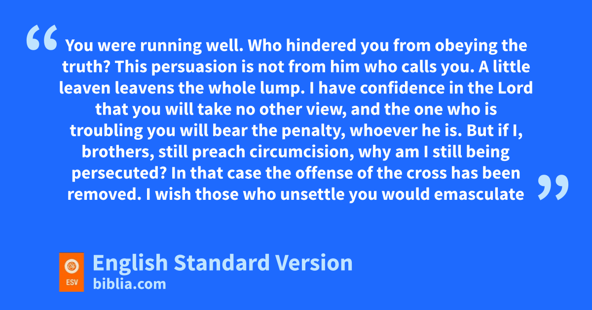 7 gYou were running well. Who hindered you from obeying hthe truth? 8 This persuasion is not from ihim who calls you. 9 jA little leaven leavens the whole lump. 10 kI have confidence in the Lord that you will ltake no other view, and mthe one who is troubling you will bear the penalty, whoever he is. 11 But if I, brothers,2 still preach3 circumcision, nwhy am I still being persecuted? In that case othe offense of the cross has been removed. 12 I wish pthose who unsettle you would emasculate themselves!