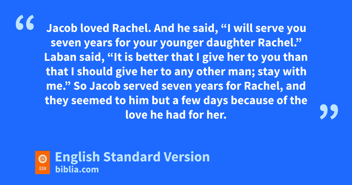 15 Then Laban said to Jacob, “Because you are my kinsman, should you therefore serve me for nothing? Tell me, what shall your wages be?” 16 Now Laban had two daughters. The name of the older was Leah, and the name of the younger was Rachel. 17 Leah’s eyes were weak,1 but Rachel was beautiful in form and appearance. 18 Jacob loved Rachel. And he said, q“I will serve you seven years for your younger daughter Rachel.” 19 Laban said, “It is better that I give her to you than that I should give her to any other man; stay with me.” 20 So Jacob qserved seven years for Rachel, and they seemed to him but a few days because of the love he had for her.