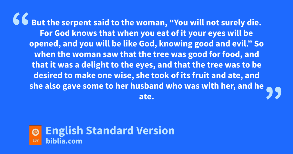 He said to the woman, “Did God actually say, ‘You1 shall not eat of any tree in the garden’?” 2 And the woman said to the serpent, “We may eat of the fruit of the trees in the garden, 3 but God said, v‘You shall not eat of the fruit of the tree that is in the midst of the garden, neither shall you touch it, lest you die.’ ” 4 wBut the serpent said to the woman, “You will not surely die. 5 For God knows that when you eat of it your eyes will be opened, and you will be like God, knowing good and evil.” 6 So when the woman saw that the tree was good for food, and that it was a delight to the eyes, and that the tree was to be desired to make one wise,2 she took of its fruit xand ate, and she also gave some to her husband who was with her, yand he ate. 7 zThen the eyes of both were opened, aand they knew that they were naked. And they sewed fig leaves together and made themselves loincloths.