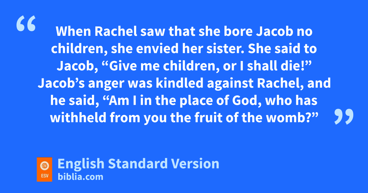 30 When Rachel saw that bshe bore Jacob no children, she envied her sister. She said to Jacob, “Give me children, or I shall die!” 2 Jacob’s anger was kindled against Rachel, and he said, “Am I in the place of God, cwho has withheld from you the fruit of the womb?” 3 Then she said, “Here is my servant dBilhah; go in to her, so that she may give birth eon my behalf,1 that even I may have children2 through her.” 4 So she gave him her servant Bilhah as a wife, and Jacob went in to her. 5 And Bilhah conceived and bore Jacob a son. 6 Then Rachel said, “God has fjudged me, and has also heard my voice and given me a son.” Therefore she called his name Dan.3 7 Rachel’s servant Bilhah conceived again and bore Jacob a second son. 8 Then Rachel said, “With mighty wrestlings4 I have wrestled with my sister and have prevailed.” So she called his name gNaphtali.5