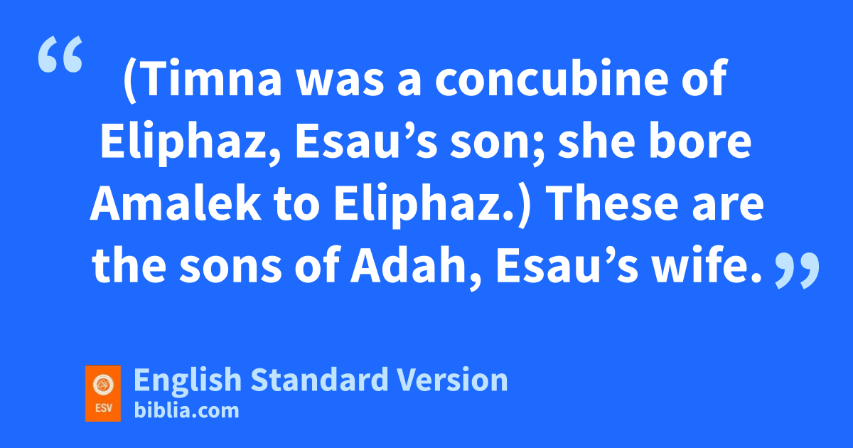 9 These are the generations of Esau the father of pthe Edomites in the hill country of Seir. 10 These are the names of Esau’s sons: qEliphaz the son of Adah the wife of Esau, Reuel the son of Basemath the wife of Esau. 11 The sons of Eliphaz were Teman, Omar, Zepho, Gatam, and Kenaz. 12 (Timna was a concubine of Eliphaz, Esau’s son; she bore rAmalek to Eliphaz.) These are the sons of Adah, Esau’s wife. 13 These are the sons of Reuel: Nahath, Zerah, Shammah, and Mizzah. These are the sons of Basemath, Esau’s wife. 14 These are the sons of sOholibamah the daughter of Anah the daughter of Zibeon, Esau’s wife: she bore to Esau Jeush, Jalam, and Korah.