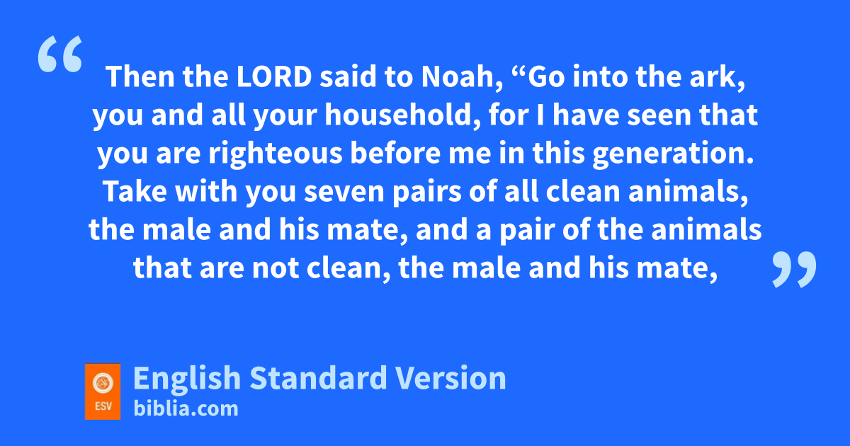 7 Then the Lord said to Noah, p“Go into the ark, you and all your household, for I have seen that qyou are righteous before me in this generation. 2 Take with you seven pairs of all rclean animals,1 the male and his mate, and a pair of the animals that are not clean, the male and his mate, 3 and seven pairs2 of the birds of the heavens also, male and female, to keep their offspring alive on the face of all the earth. 4 For in seven days sI will send rain on the earth forty days and forty nights, tand every living thing3 that I have made I will blot out from the face of the ground.” 5 uAnd Noah did all that the Lord had commanded him.