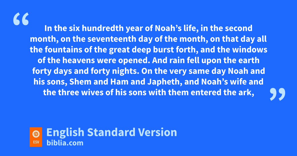 11 In the six hundredth year of Noah’s life, in the second month, on the seventeenth day of the month, on that day all the vfountains of the great deep burst forth, and wthe windows of the heavens were opened. 12 And rain fell upon the earth forty days and forty nights. 13 On the very same day Noah and his sons, Shem and Ham and Japheth, and Noah’s wife and the three wives of his sons with them entered the ark, 14 they and every beast, according to its kind, and all the livestock according to their kinds, and every creeping thing that creeps on the earth, according to its kind, and every bird, according to its kind, every winged creature. 15 They xwent into the ark with Noah, two and two of all flesh in which there was the breath of life. 16 And those that entered, male and female of all flesh, went in yas God had commanded him. And the Lord shut him in.